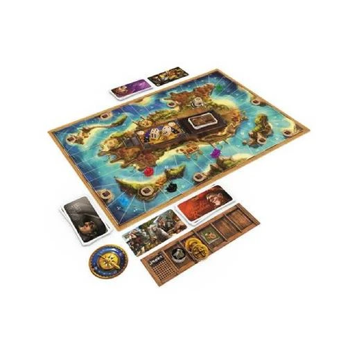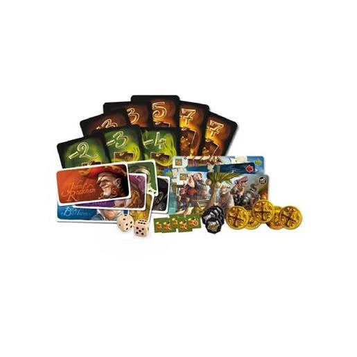 Incluye: 1 tablero, 66 cartas de acción, 12 de tesoro, 80 doblones de oro, 45 fichas de víveres, 45 fichas de pólvora, 9 fichas de tesoro, 1 brújula, 2 dados de acción, 6 barcos, 6 bodegas, 1 dado de combate y 1 reglamento.