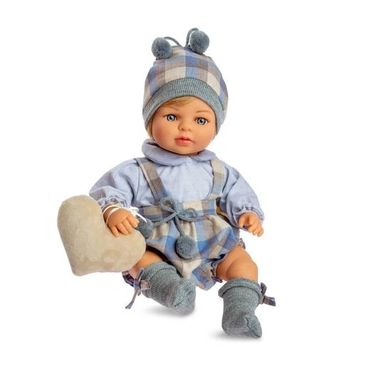 Laura es un guapísimo niño rubio vestido con un peto azul vichy y un gorrito a juego. También lleva un peluche de corazón en su mano. Además, al presionarle la barriguita dice mamá y papá.