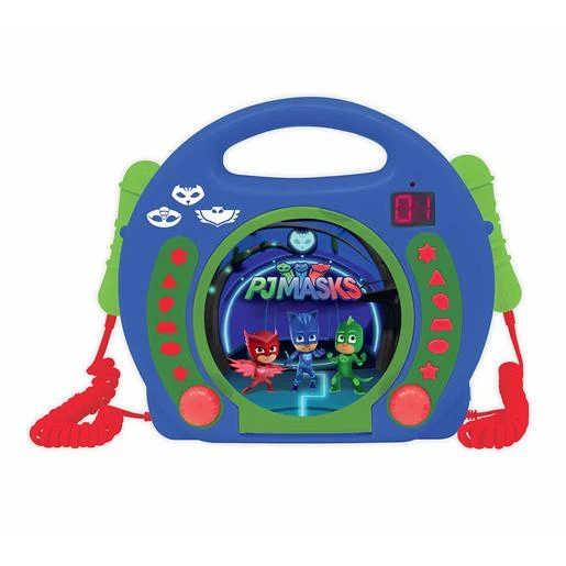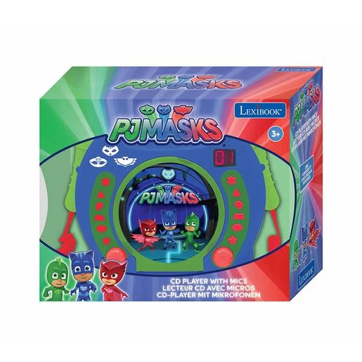 Pj Masks – Lector CD Portatil con 2 Microfonos, un reproductor de cd de los personajes de tu serie de TV favorita Pj Masks. Los fas de esta exitosa serie pueden disfrutar del karaoke con este reproductor, hecho especialmente para los niños que les encanta la música. El lector de CDs de karaoke tiene un diseño increíble y no solo toca CDs sino también puede ser usado para cantar con los dos micrófonos. ¡Puedes llevarlo a donde quieras y disfrutar en familia o con amigos! Funciona con 4 pilas tipo C (NO incluidas). Edad recomendada +3 años.